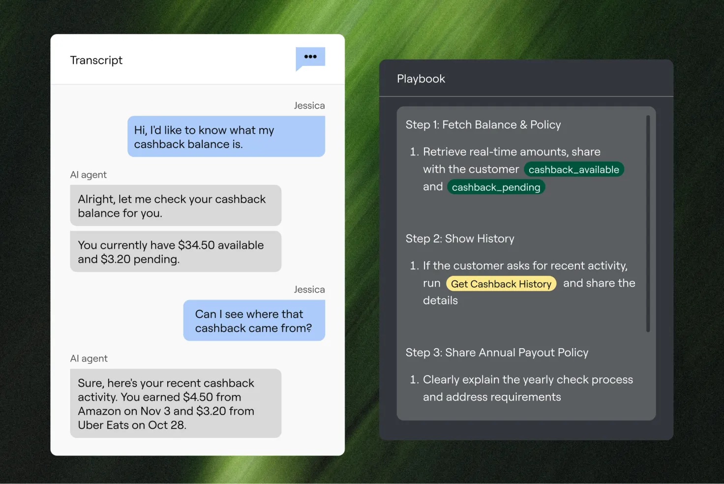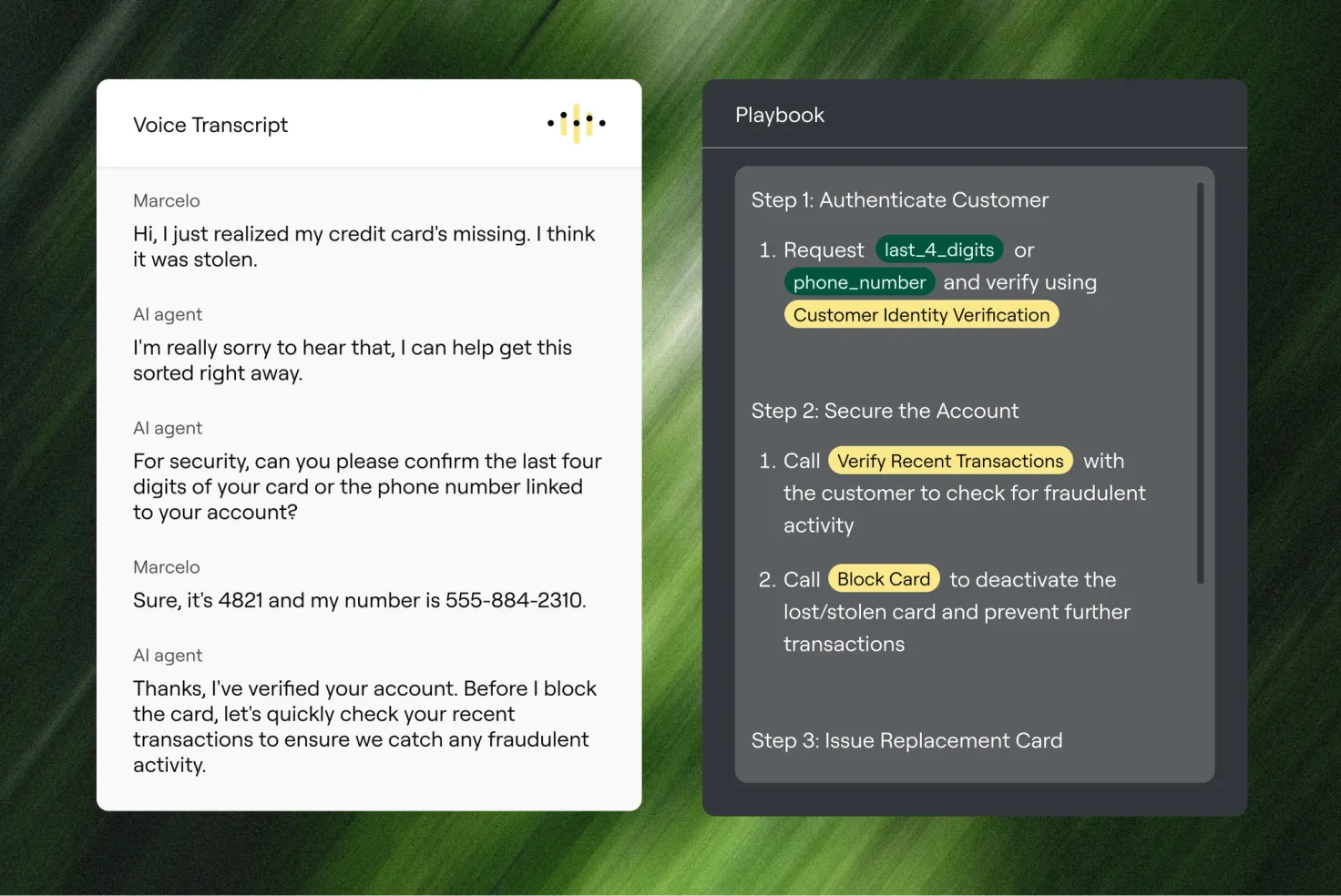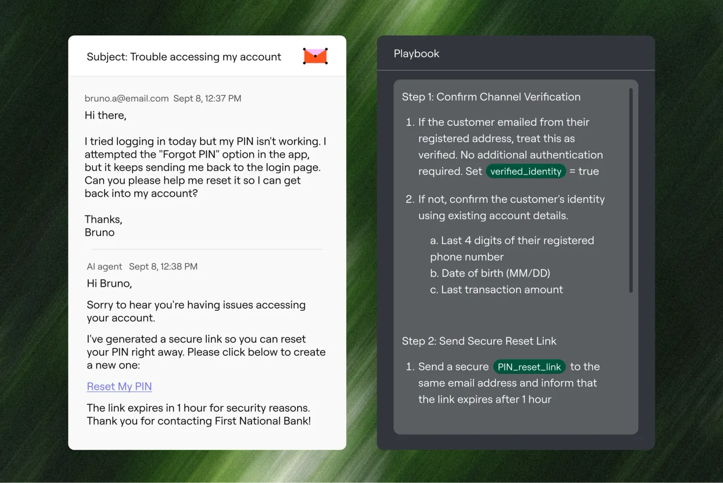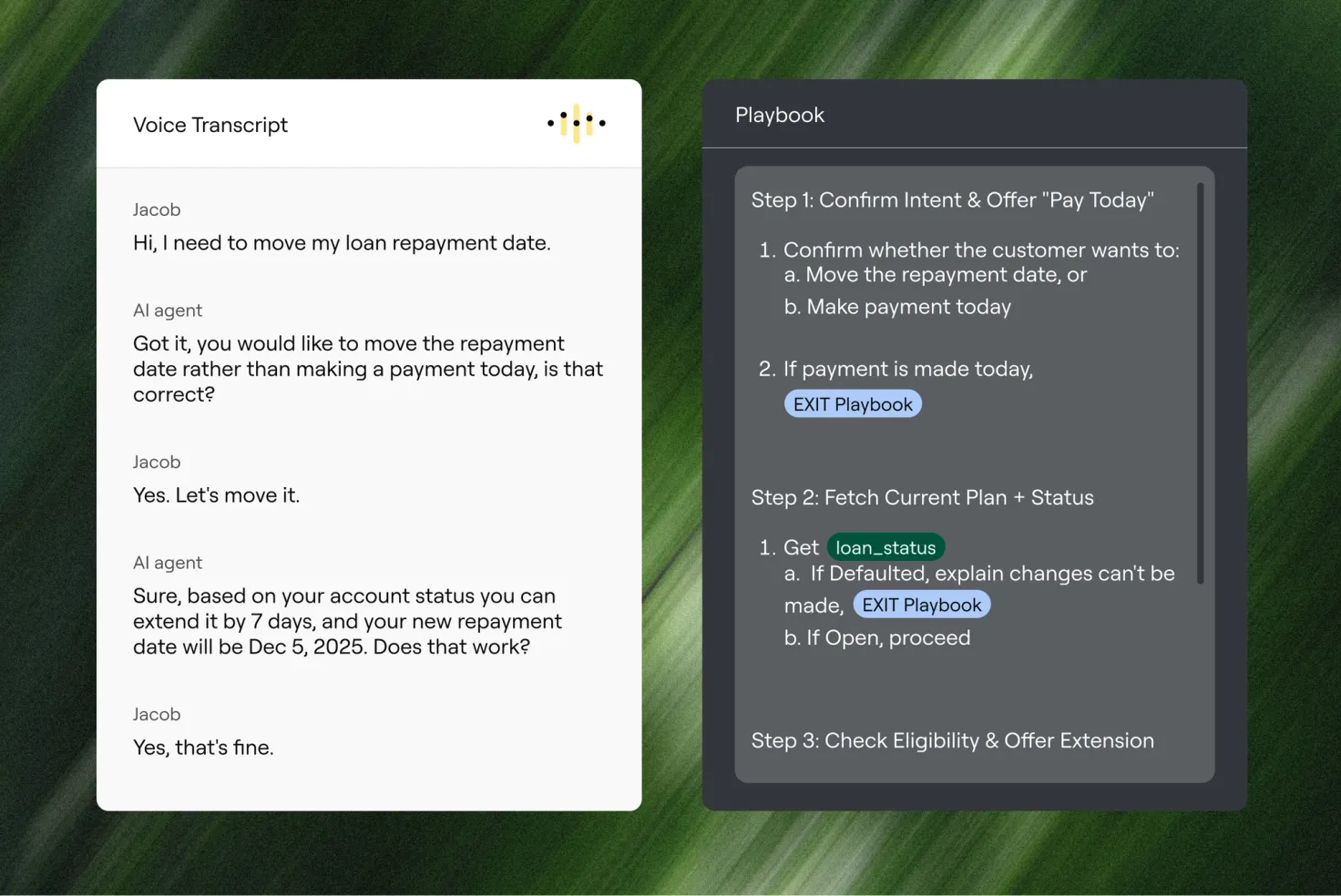 Playbooks turn high-volume financial services interactions into defined workflows with clear steps, system integrations, and escalation logic—ensuring policy adherence every time. They ensure that when an AI agent extends a repayment date, blocks a stolen card, or confirms a deposit window, it follows the same operational guardrails every time—across voice, messaging, and email.